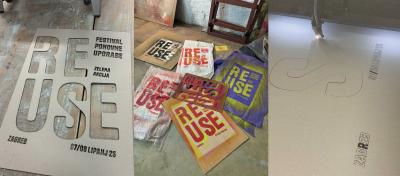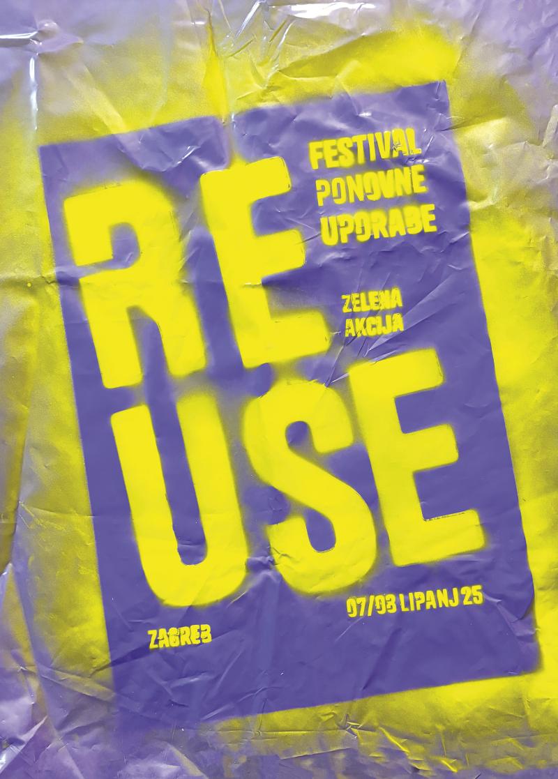 Reuse Festival koji organizira Zelena akcija promovira ponovnu uporabu predmeta kao način očuvanja okoliša i uštede novca. Na festivalu se popravljaju stari kućanski uređaji, bicikli i drugi predmeti. Plakati se ne tiskaju, već nastaju na starim, korištenim materijalima (plastika, karton...) sprejanjem tipografske šablone. I sama šablona može poslužiti kao plakat. Programske letke čine stare fakultetske skripte, također presprejane, kako bi se iskoristilo što više otpada.Reuse Festival promovira očuvanje okoliša I popravlja stare predmete, a plakati i letci nastaju od recikliranih materijala sprejanjem tipografske šablone.
