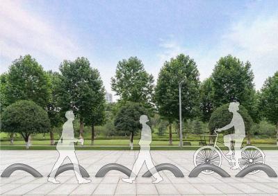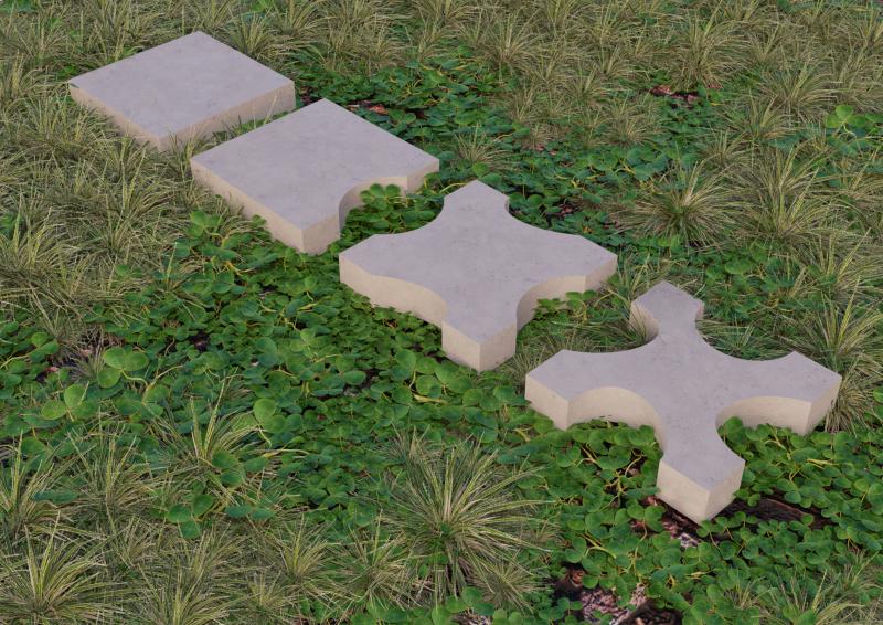 Sami opločnici osmišljeni su prema principu uvođenja prirode u urbano okruženje. Oni funkcioniraju kao gradijent otvora kroz koje prodire trava, simbolizirajući prisutnost prirode u gradu. Zahvaljujući svojoj plošnoj konfiguraciji, opločnici najbolje djeluju kada su postavljeni u ravnini, bez uzvišenja/prekida, poput ceste ili nogostupa. Zbog toga, za razgraničenje kolnika i pješačke zone, odabrani su stupići kao urbana oprema. Dolaze u tri veličine, a njihova forma inspirirana je drvećem koje izranja iz tla. Oblikovani su u formi luka, pri čemu donja, negativna površina odgovara otvorima u opločnicima, a baza se svih stupića savršeno uklapa u rubni otvor opločnika. Na taj se način uspostavlja vizualna i funkcionalna povezanost.