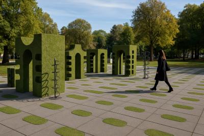 Opločnik predstavlja spoj dvaju sličnih motiva koji u kombinaciji stvaraju modularnu, dinamičnu i vizualno privlačnu površinu. Reflektirane betonske ploče dimenzija 80x60, tj. 80x120 cm (spojeno u kalupu) omogućuju fleksibilnost u slaganju – mogu se koristiti pojedinačno ili u paru, stvarajući niz kombinacija i uzoraka. Centralni polukružni usjek (30×50 cm, R=15 cm) unosi ritam i simboliku koraka, pozivajući na interakciju korisnika s površinom. Bočne širine od 45 cm osiguravaju stabilnost, dok valoviti dodaci asociraju na tok vode i gibanje, unoseći osjećaj fluidnosti i zajedništva. Opločnik se može postavljati linearno, ogledalno ili u slobodnim konfiguracijama, omogućujući kreativna rješenja – od strogo geometrijskih do organskih oblika, čime se oblikuje suvremeni javni prostor s naglaskom na estetiku, funkcionalnost I ljudsku prisutnost.