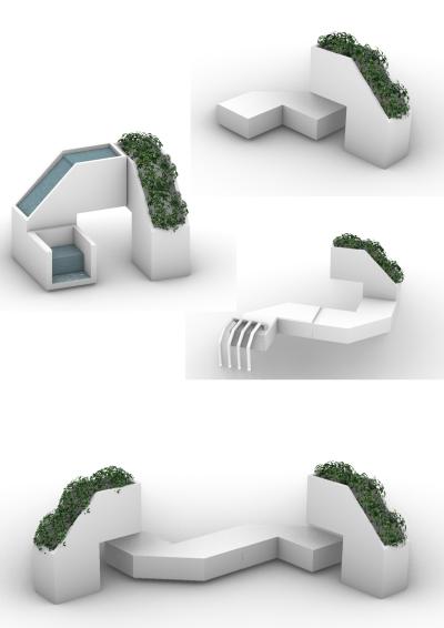 Urbana oprema inspirirana je oblikom prethodno dizajniranog opločnika. Rezanjem, udubljivanjem i dodavanjem segmenata oblika nastaju klupice, žardinjere, dekorativne fontane, fontane za ljude i životinje, ležaljke te prostor za odlaganje bicikala. Elementi se mogu međusobno kombinirati i slagati na različite načine prilagodljive prostoru u kojem se nalaze. Različitim načinima slaganja stvaraju se odnosi punog i praznog koji otvaraju dodatne mogućnosti za interakciju.