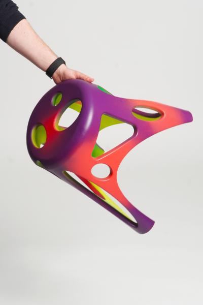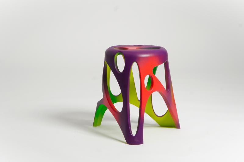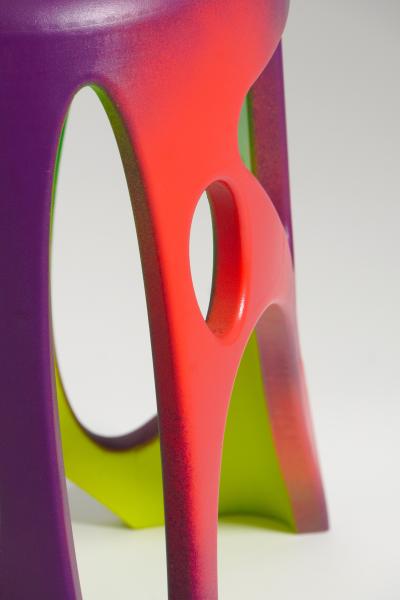 Moj semestralni rad dizajniranja stolice bavi se mikroplastikom i njezinim utjecajem na okoliš. Inspiriran podatkom da mikroplastika zaustavlja rast biljaka, oblikovao sam niski pomoćni tronožac 3D printanjem, modernizirajući tradicijski hrvatski tronožac. Presvlaka, inspirirana mikroskopskim prikazima drvnog tkiva, koristi oblike i boje (krug, elipsa, trokut, roze, crvena, ljubičasta), dok žutozelena unutrašnjost simbolizira skrivenu mikroplastiku. Stolica (1,2 kg) lako se sastavlja, printa se kod kuće, a rupe joj smanjuju težinu i olakšavaju nošenje, spajajući ekologiju i tehnologiju.